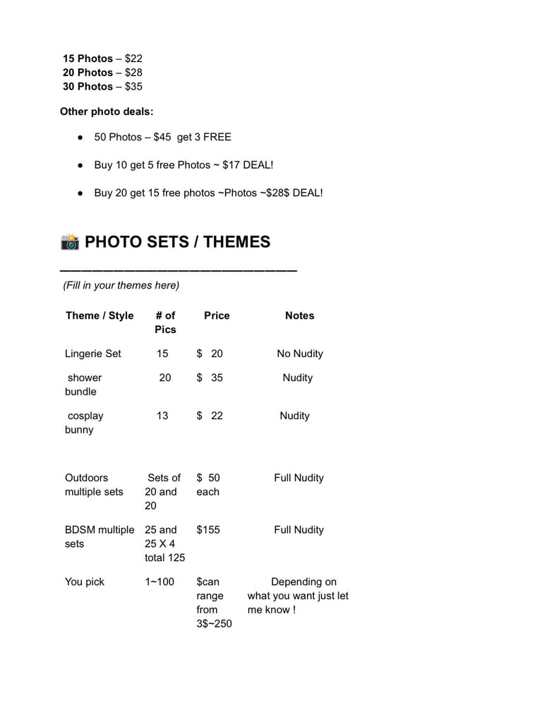 Theme / Style - # of Pics - Price - Notes